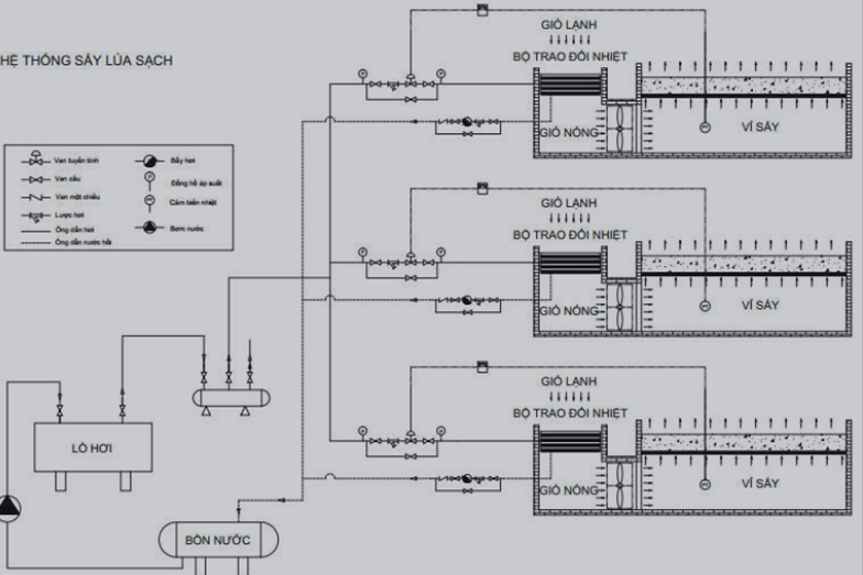 Trấu tươi được đưa vào buồng đốt của nồi hơi tầng sôi, tại đây lượng nhiệt sinh ra của trấu được lò hơi hấp thụ ~85%, lượng nhiệt này sẽ nung nước trong nồi thành hơi, với áp suất 5-6 kG/cm2, nhiệt độ hơi tương đương khoảng 159-165 oC, lượng hơi này sẽ theo ống dẫn hơi cung cấp cho 12 hầm sấy, tại từng hầm sấy hơi được đưa vào các bộ trao đổi nhiệt (calorifer) qua các cụm van điều khiển cấp hơi tự động, cụm này hoạt động với nguyên lý như sau: khi nhiệt độ hầm sấy dưới nhiệt độ cài đặt, van điện từ sẽ mở cho hơi đi vào bộ trao đổi nhiệt, bộ trao đổi nhiệt sẽ gia nhiệt cho không khí nóng lên và đưa vào hầm sấy, khi nhiệt độ hầm sấy lên đến 40oC thì van điện từ tự động ngắt không cho hơi nóng tiếp tục vào bộ calorifer, khi nhiệt độ giảm xuống 0.5 - 1 độ (có thể chỉnh tùy ý) thì van điện từ tiếp tục cấp hơi vào bộ trao đổi nhiệt. Vì thế nhiệt độ hầm sấy được duy trì 1 cách chính xác và tự động hoàn toàn. Hơi sau khi gia nhiệt gián tiếp cho không khí sấy thì ngưng tụ lại thành nước, phần nước sẽ được đưa ra khỏi bộ trao đổi nhiệt thông qua cụm tách nước ngưng tự động, cụm này hoạt động với nguyên lý giữ phần hơi lại và cho phần nước ngưng đi ra khỏi bộ trao đổi nhiệt. Nước ngưng sau khi ra khỏi bộ trao đổi nhiệt sẽ được đưa về bình chứa nước ngưng tại lò hơi. Tại đây nước ngưng sẽ được bơm vào lò hơi với nhiệt độ 85-90 oC và cứ
