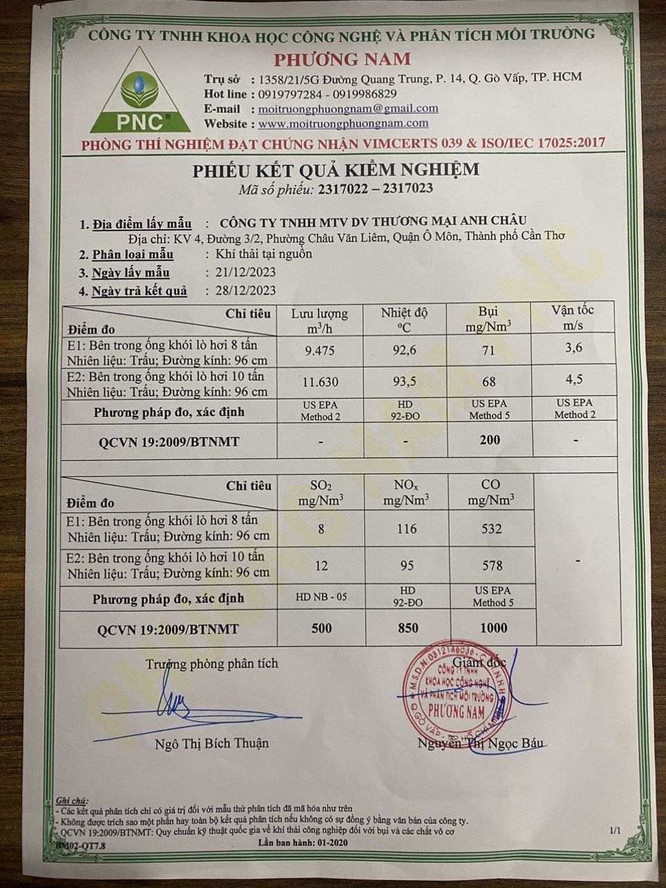 Mẫu quan trắc môi trường lò hơi 8 tấn và 10 tấn quí 4 năm 2023